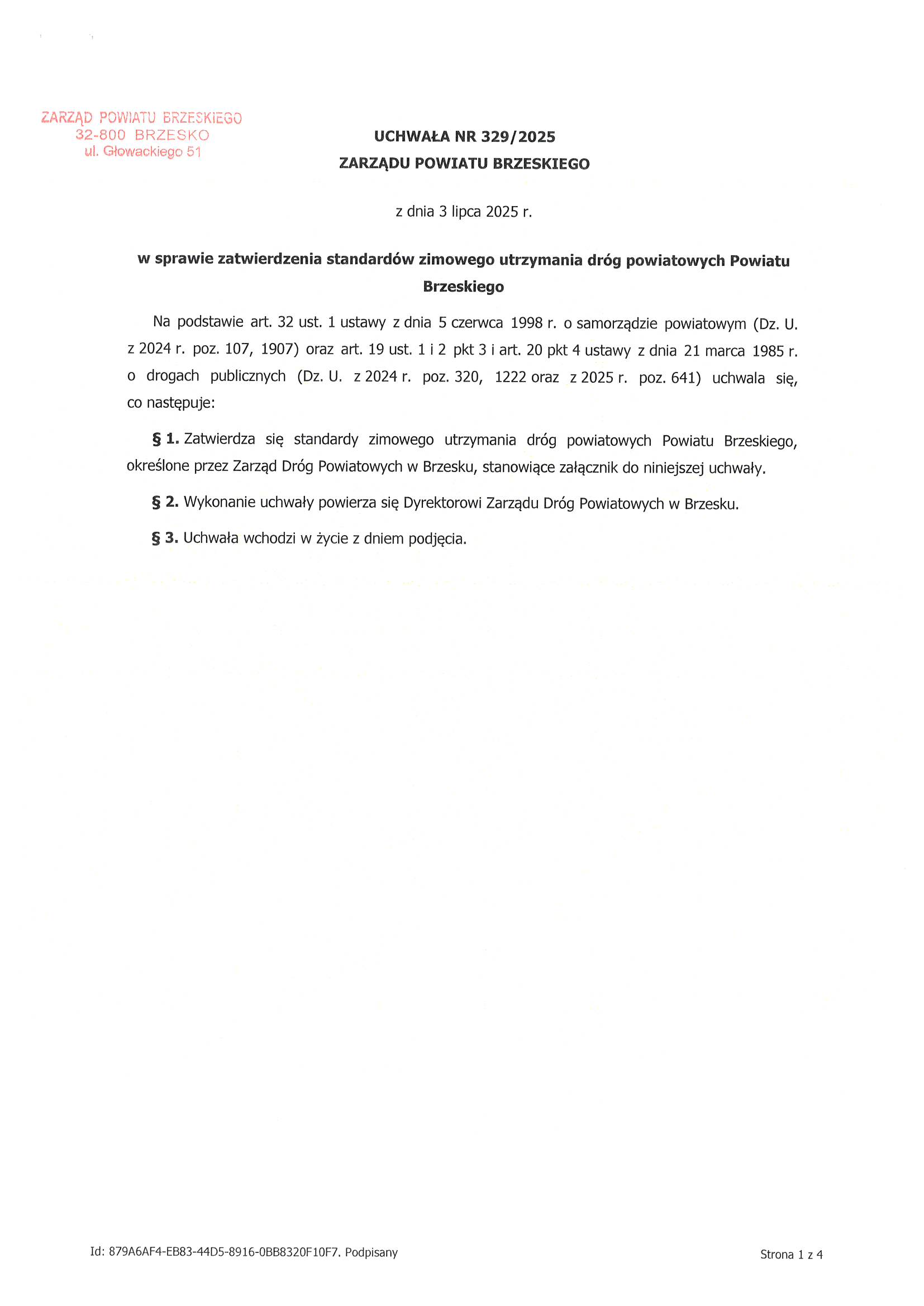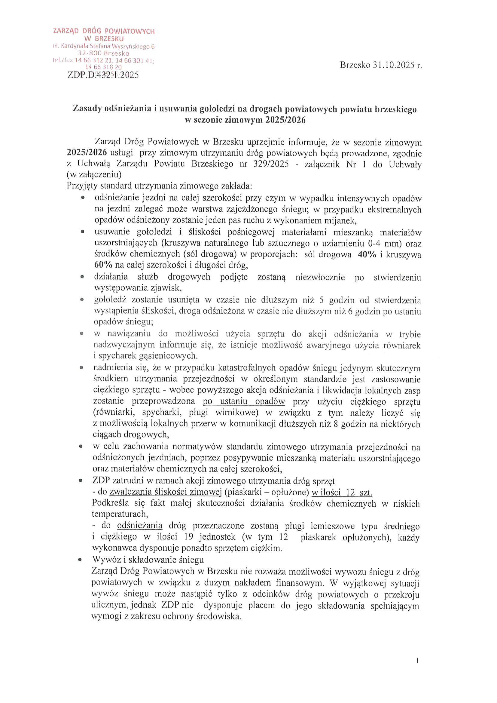 1.Uchwała w sprawie zatwierdzenia standardów zimowego utrzymania dróg na drogach powiatowych Powiatu Brzeskiego.